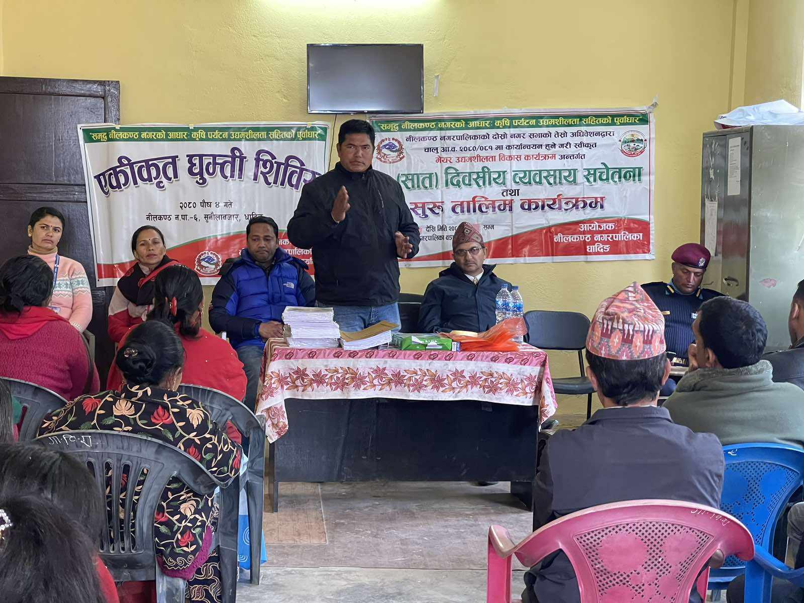 धादिङको नीलकण्ठ नगरपालिका वडा नम्बर ६ सुनौला बजारमा सातदिने व्यवसाय सचेतना तालिम सुरु भएको छ । नीलकण्ठ नगरपालिकाको आयोजनामा चालु आर्थिक बर्ष २०८०/०८१ मा कार्यान्वय हुने गरी स्वीकृत भएको मेयर उद्यमशीलता विकास कार्यक्रम अन्तर्गत तालिम सुरु गरीएको हो।नीलकण्ठ नगरपालिकाको १४ वटै वडामा प्रत्येक वडाका २५ जनाको सहभागिता रहने गरी तालिम सन्चालन गरिने प्रशिक्षक सम्झना भण्डारीले जानकारी दिनुभएको छ । पहिलो चरणको सात दिने तालिम लिएर व्यवसाय सुरु गर्नेहरुलाई नीलकण्ठ नगरपालिकाले २ लाख देखी १५ लाख सम्म सहुलियत कर्जा उपलब्ध गराउनेछ ।२ लाख सम्मको लागि बिना धितो र २ लाख भन्दा बढीको हकमा धितो राखेर कर्जा उपलब्ध गराईने नीलकण्ठ नगरपालिकाका उप मेयर दिपक विश्वकर्माले जानकारी दिनुभयो ।