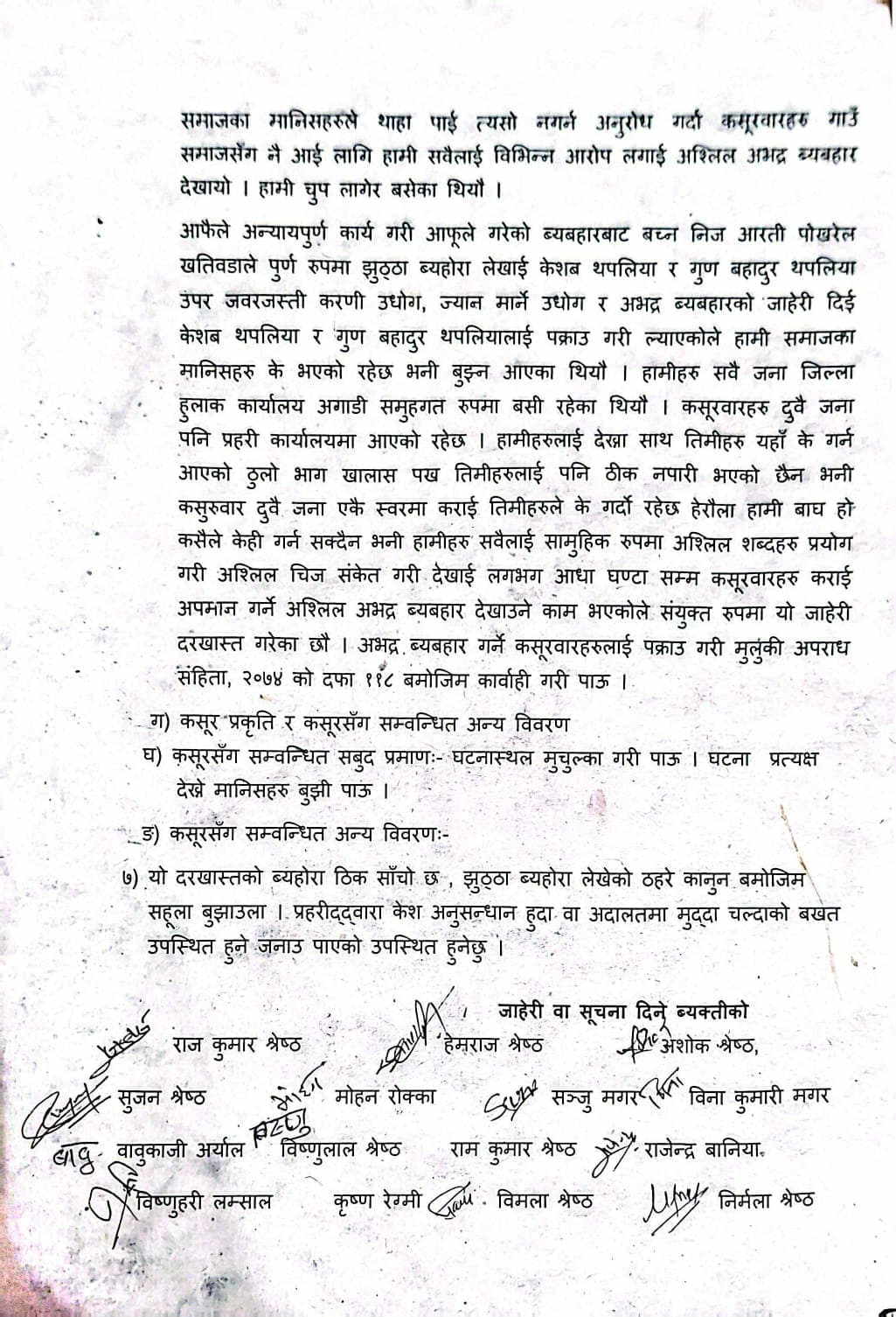 त्यही घट्नालाई लिएर जबरजस्ती करणी उद्योगसम्बन्धी आरोप झुठो भएको भन्दै स्थानीयवासीले कानूनको दुरुपयोग गरी कसैलाई फसाउने कार्य तत्काल रोक्नुपर्ने माग गरेका छन्। बुधबार वडा नम्बर ८ का २५० भन्दा बढी गाउँलेले हस्ताक्षर गरेर प्रहरीलाई घटनाको सत्यतथ्य जाँचबुझ गर्न र गलत आरोप लगाई वदनाम गर्नेमाथि कारवाहीको माग गरेका हुन् ।स्थानीयका अनुसार घाँस काट्ने क्रममा विवाद सहित झगडा भएको हो । तर दिउँसो वरपर प्रतक्ष्यदर्शी भएको समयमा बलात्कार जस्तो प्रयासको आरोप गलत छ स्थानीयले बताएका छन् । दुवै जनालाई प्रहरीले नियन्त्रणमा लिएपछि घटनाको वास्तविकता फरक रहेको भन्दै स्थानीयहरू बुधवार जिल्ला प्रहरी कार्यालय धादिङ पुगेर प्रहरीलाई लिखित निवेदन पेश गरि जाहेरी खारेजीको माग गरेका हुन् ।घटनामा पिडक भनिएका व्यक्तिमाथि कानूनको दुरुपयोग गरी फसाउन खोजिएको आरोप गाउँलेहरूको छ। निराधार आरोपका आधारमा व्यक्तिको प्रतिष्ठा नष्ट हुने खालका गतिविधि गर्न नहुने स्थानीय सरिता श्रेष्ठले बताउनुभयो।