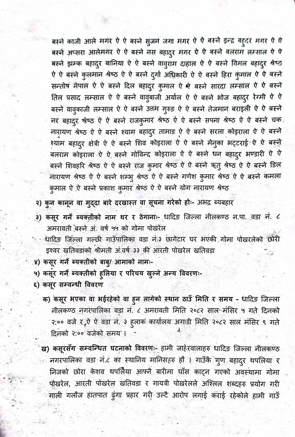 बारिको साँदको घाँस काट्ने विषयमा विवाद हुँदा नीलकण्ठ नगरपालिका वडा नम्बर ८ का पुर्व वडा अध्यक्ष र छोरामाथि बलात्कारको झुटो मुद्वा लगाईएको स्थानियले बताएका छन् । घट्ना हँुदा प्रतक्ष्यदर्शी सोमा तामाङ र रपेश कुमालका अनुसार घाँसको विषयमा विवाद भएको आफुहरुले देखेको बताएका छन् ।स्थानीयका भनाई अनुसारे घटना नितान्त छिमेकीबीचको झगडा भएको हो्। सार्वजनिक जग्गा भोगचलनका विषयमा दुई छिमेकीबीच पहिलेदेखि नै मनमुटाव रहेको र यसअघि पनि झैझगडा हुँदै आएको उनीहरूको भनाइ छ। सार्वजनिक ठाउँमा दुई पक्षबीच भनाभन र हात हालाहाल हुनुलाई बलात्कार प्रयासको रूपमा दुष्प्रचार गरिनु गलत भएको गाउँलेहरुको भनाई छ ।